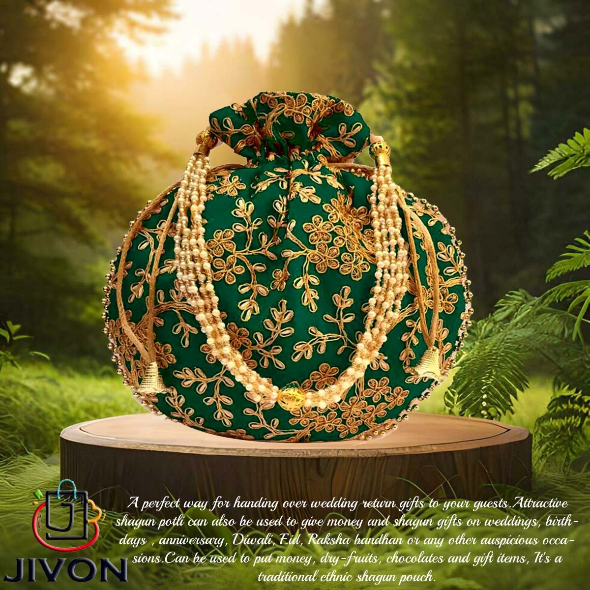 JIVON POTLI BAGS CRAFTED WITH LOVE USING TRADITIONAL TECHNIQUES, THEY FEATURE INTRICATE DESIGNS THAT ADD A TOUCH OF SOPHISTICATION TO ANY OUTFIT. PERFECT FOR WEDDINGS, SPECIAL OCCASIONS, OR SIMPLY MAKING A STYLISH STATEMENT!